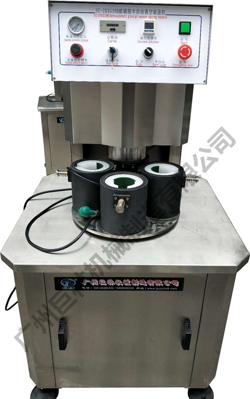 三(四)旋盖玻璃瓶半自动真空旋盖机是我司集多年生产经验自行研制而成,属国内独创,它采用真空泵抽真空的方式,可获得很高的真空度,旋盖扭力及真空度均可按需设定,独特的设计使它可兼容多种不同形状、尺寸的瓶子旋盖,兼容性强,且调整方便。性能稳定可靠。广泛适用于食品、罐头、调味品、保健品等行业中三(四)旋马口铁盖玻璃瓶的真空旋盖。